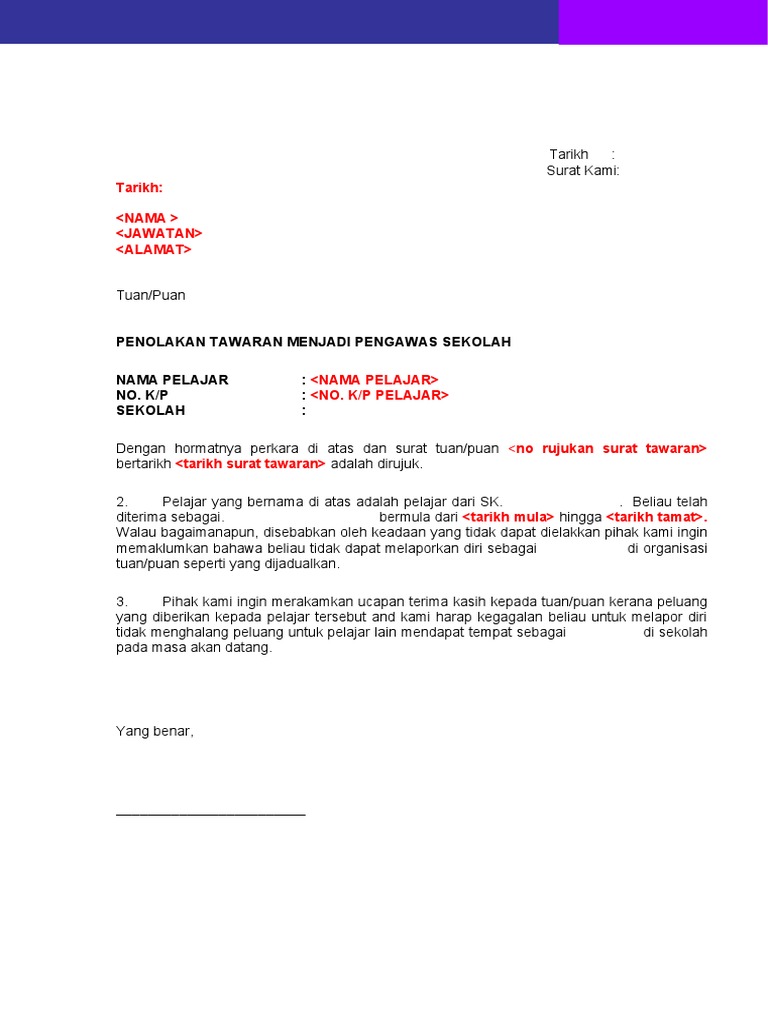 Surat Penolakan Jawatan Pengawas Pdf